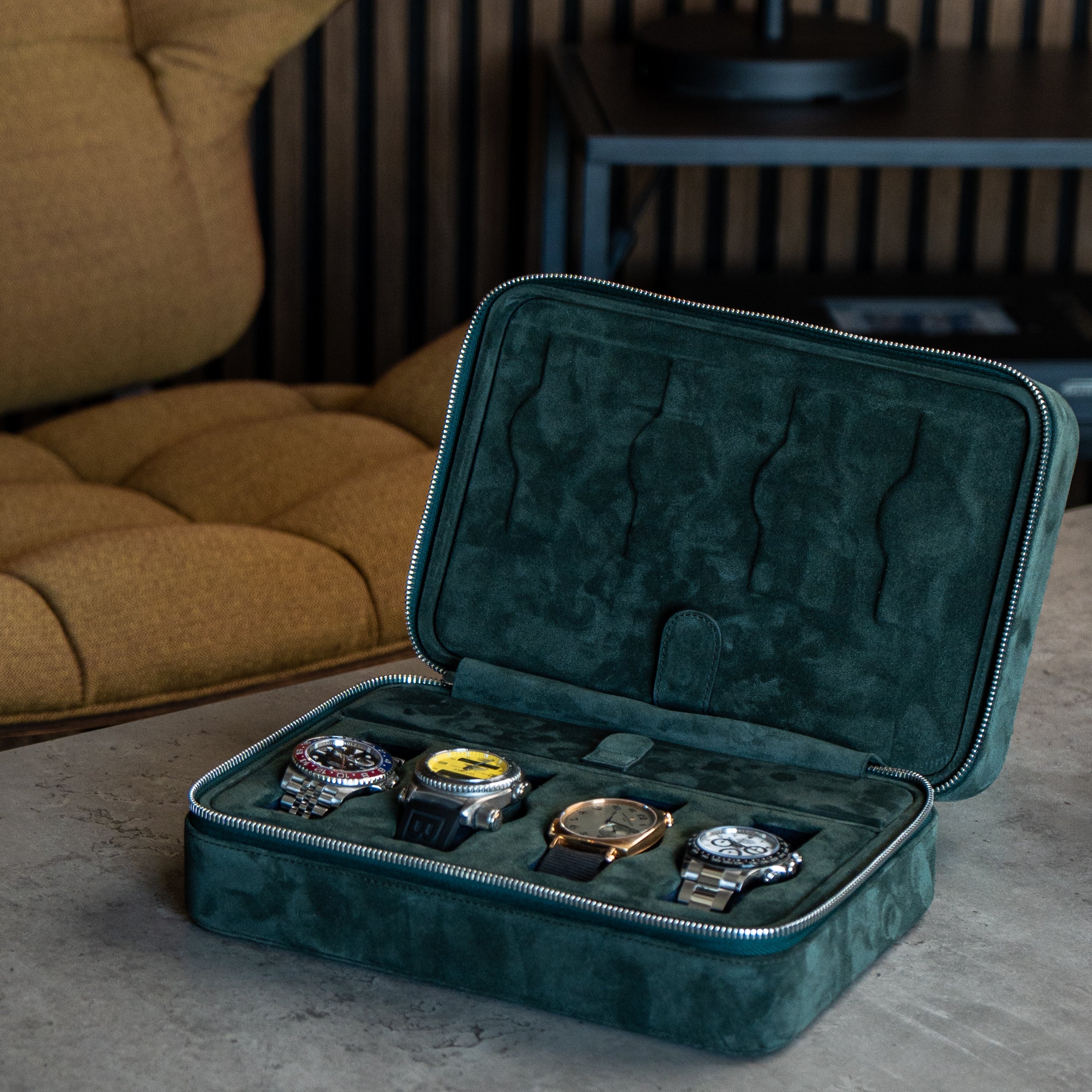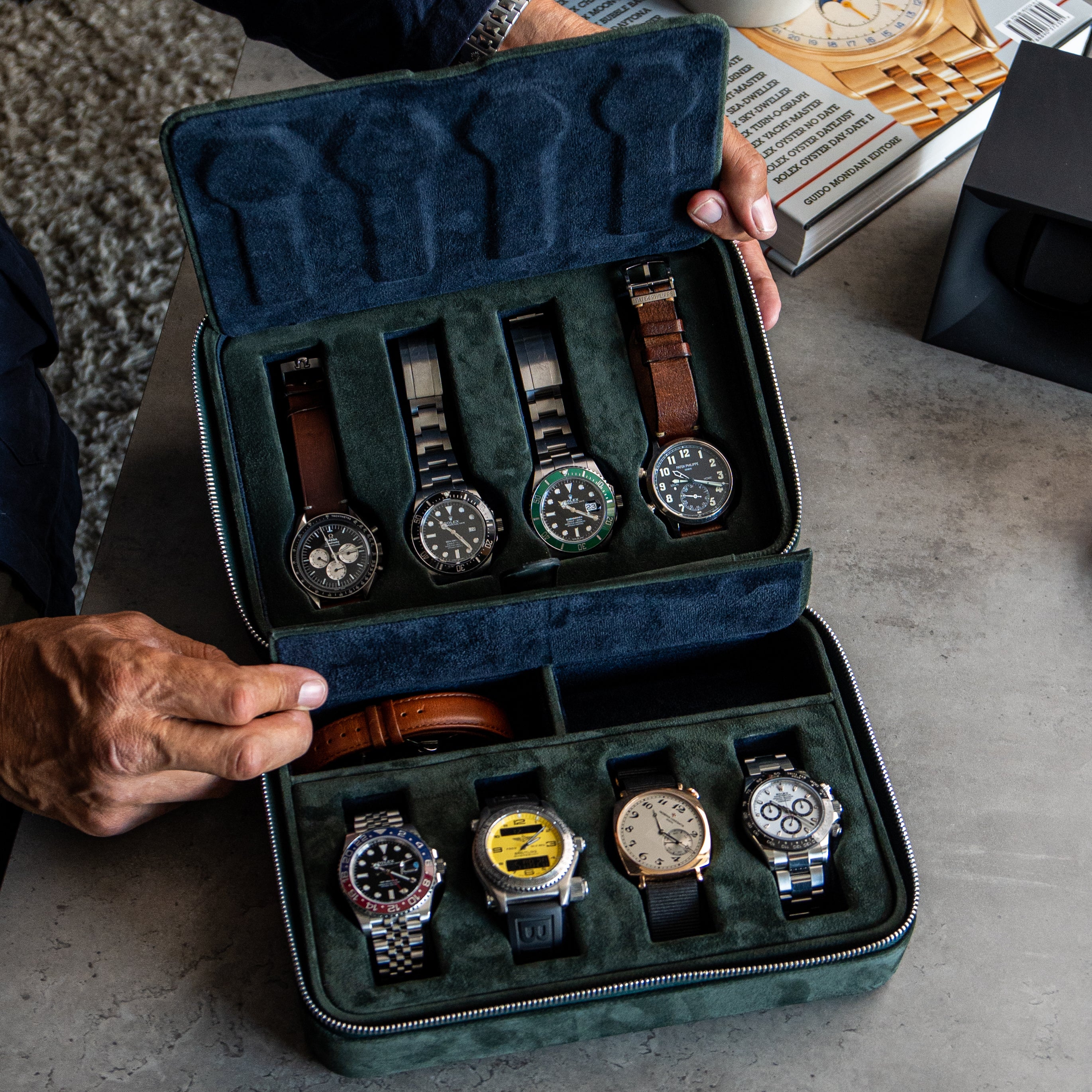 An exquisite home for your watch collection, our forest green watch box for eight watches securely stores your watches in style. The watch box is made in Italy, by skilled craftsmen with locally sourced suede leather.