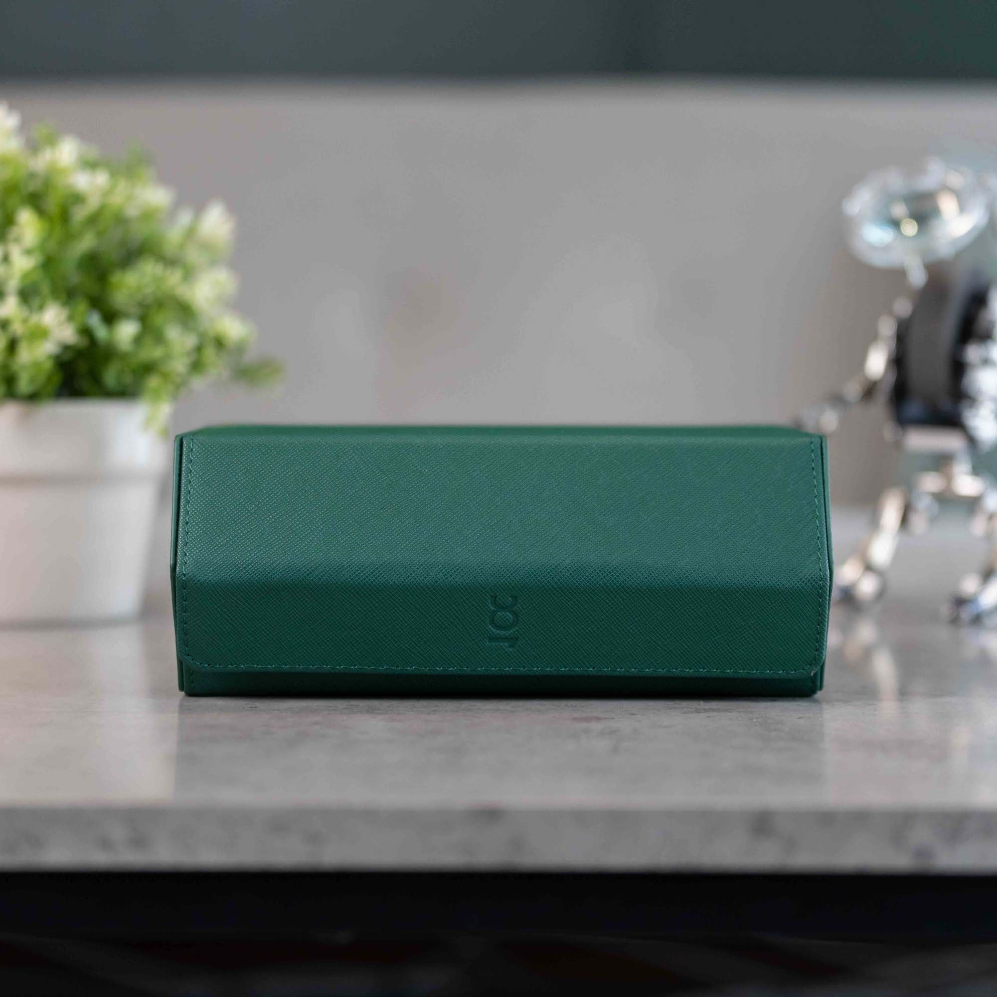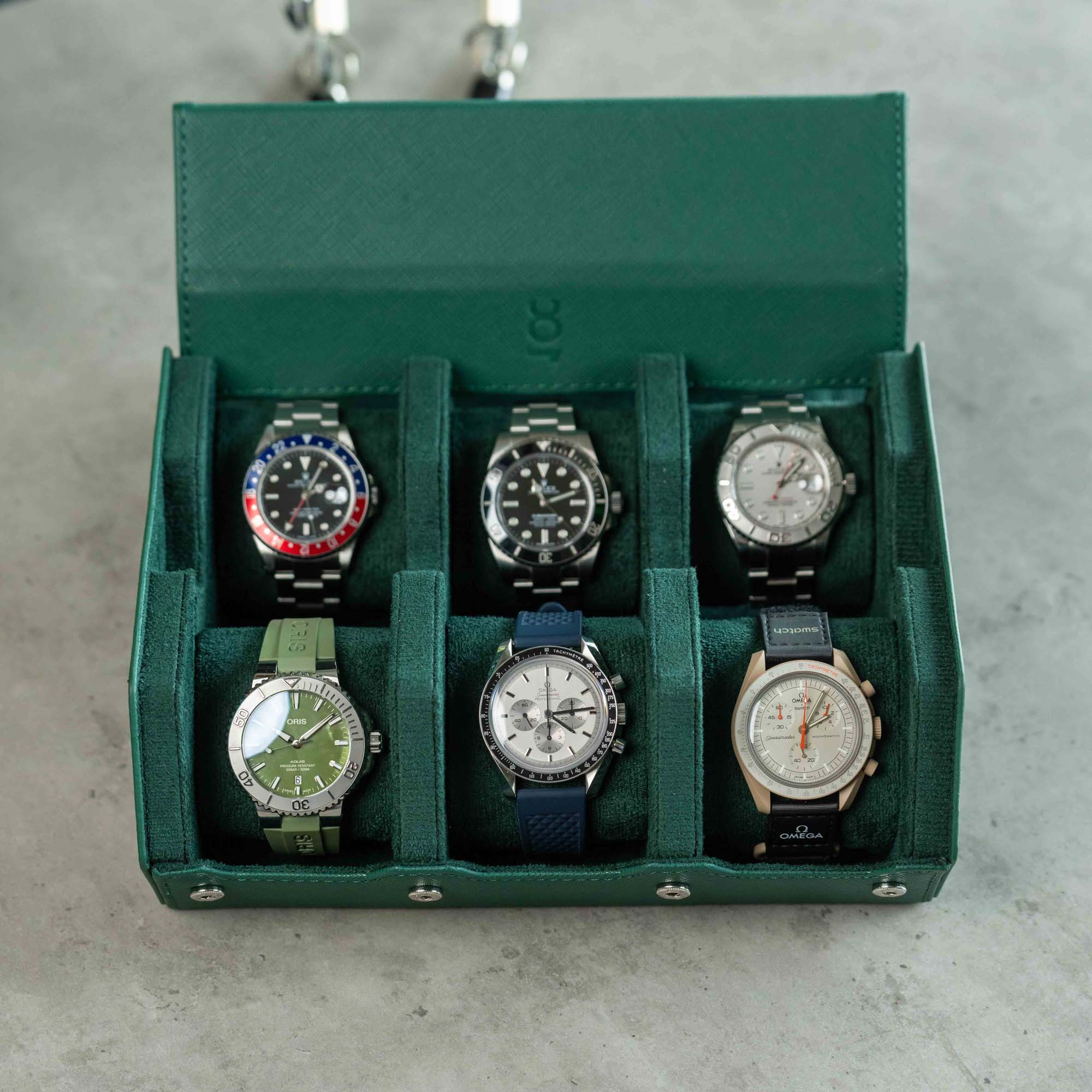 A perfect mix between a watch roll and a watch box. Introducing our watch box for 6 watches with removable cushions for each individual watch using a sliding system. It's specifically designed for watch enthusiasts and watch collectors to protect their prized possessions - whether it is for traveling or to store it at home. The Watch Box is handmade of fine genuine "Rolex Green" saffiano leather and holds up to six watches.