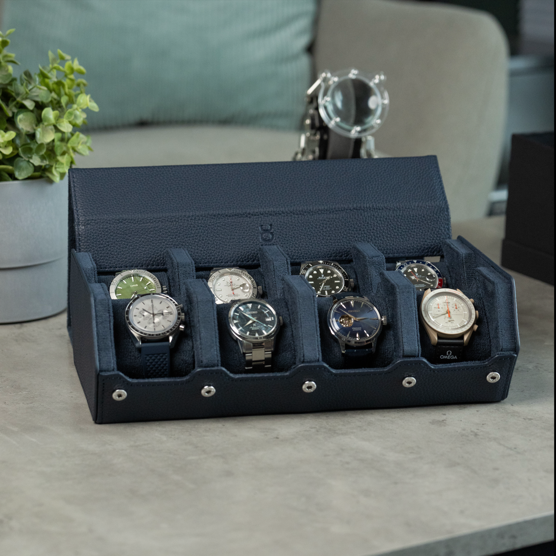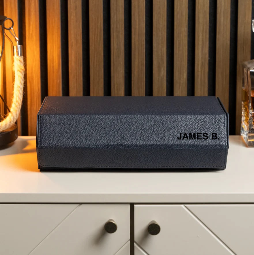 A perfect mix between a watch roll and a watch box. Introducing our watch box for 8 watches with removable cushions for each individual watch using a sliding system. It's specifically designed for watch enthusiasts and watch collectors to protect their prized possessions - whether it is for traveling or to store it at home. The Watch Box is handmade of fine genuine navy blue litchi leather and holds up to eight watches.