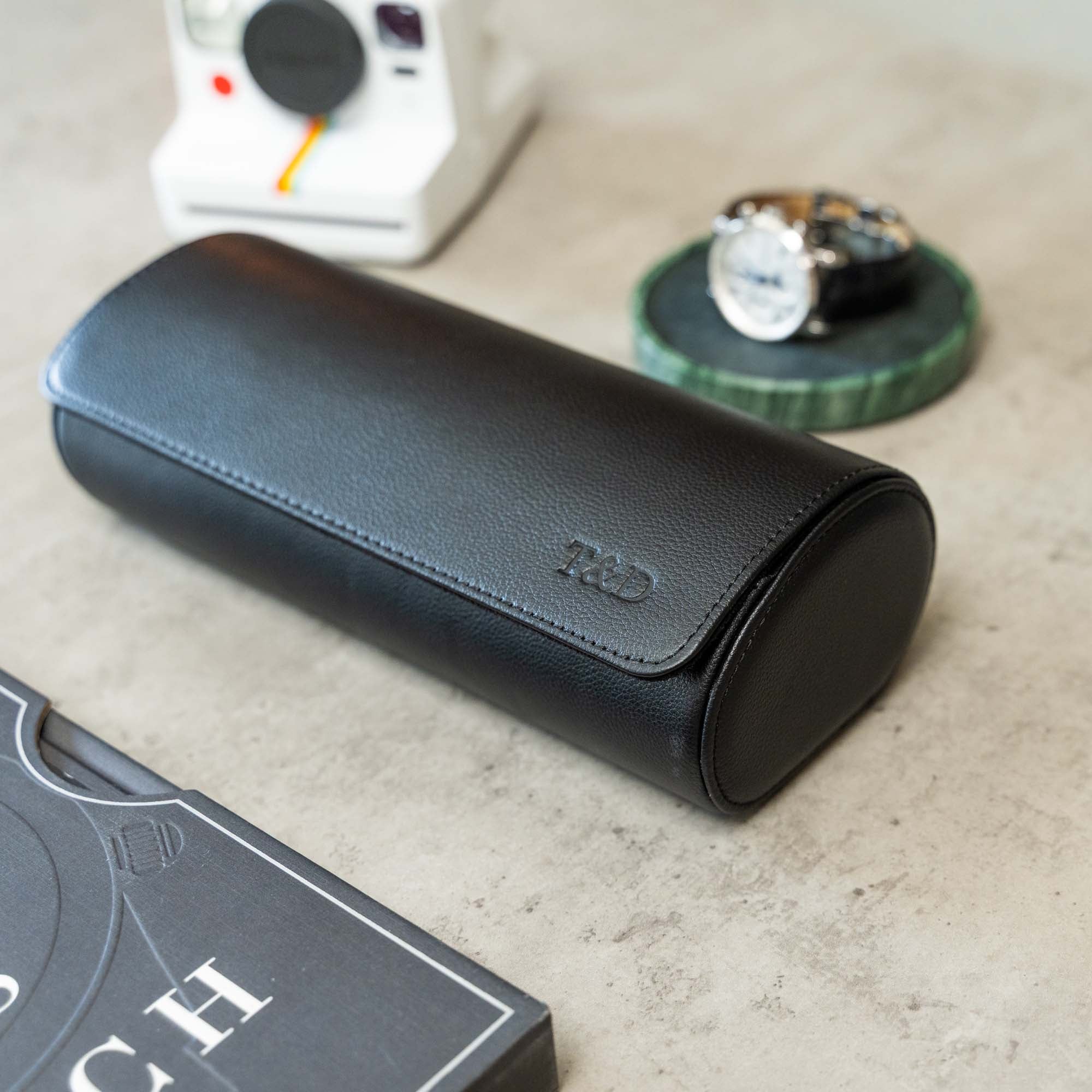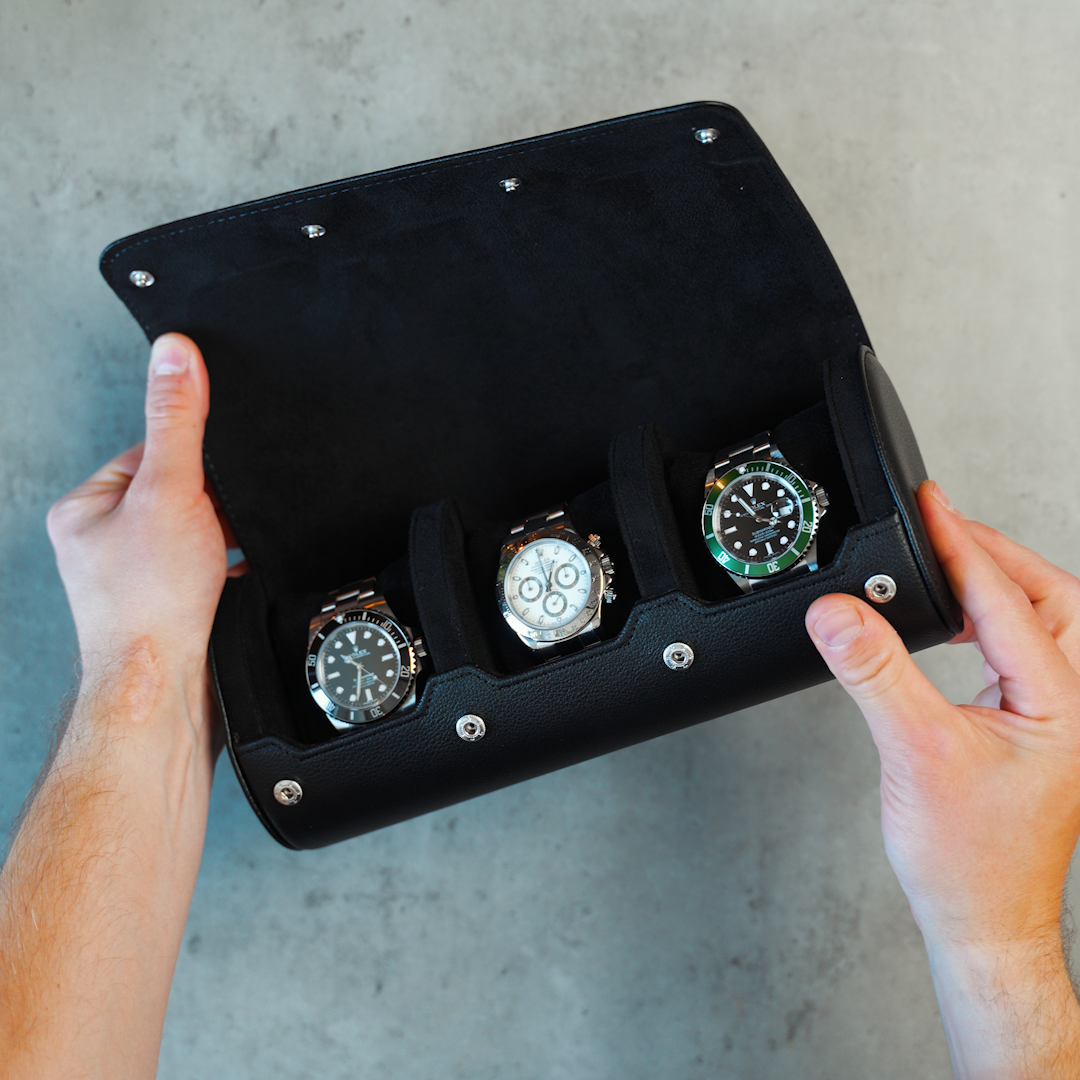 The Large Watch Roll is handmade of fine black genuine leather and holds up to three watches. The Watch Roll is ideal to carry your favourite watches with you on any occasion, or for daily storage.
