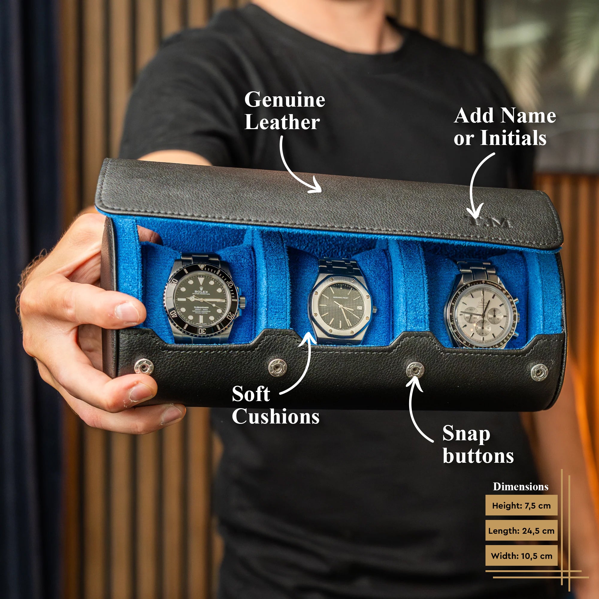 The Large Watch Roll is handmade of fine black genuine leather and holds up to three watches. The Watch Roll is ideal to carry your favourite watches with you on any occasion, or for daily storage.