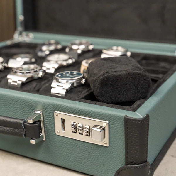 Keep your timepieces secure and organized with this sophisticated watch suitcase. Designed for home storage, it holds up to 20 watches in a sleek and durable case. Crafted with premium materials such as genuine leather and soft velvet. This watch trunk is the perfect blend of style and protection for any collector.