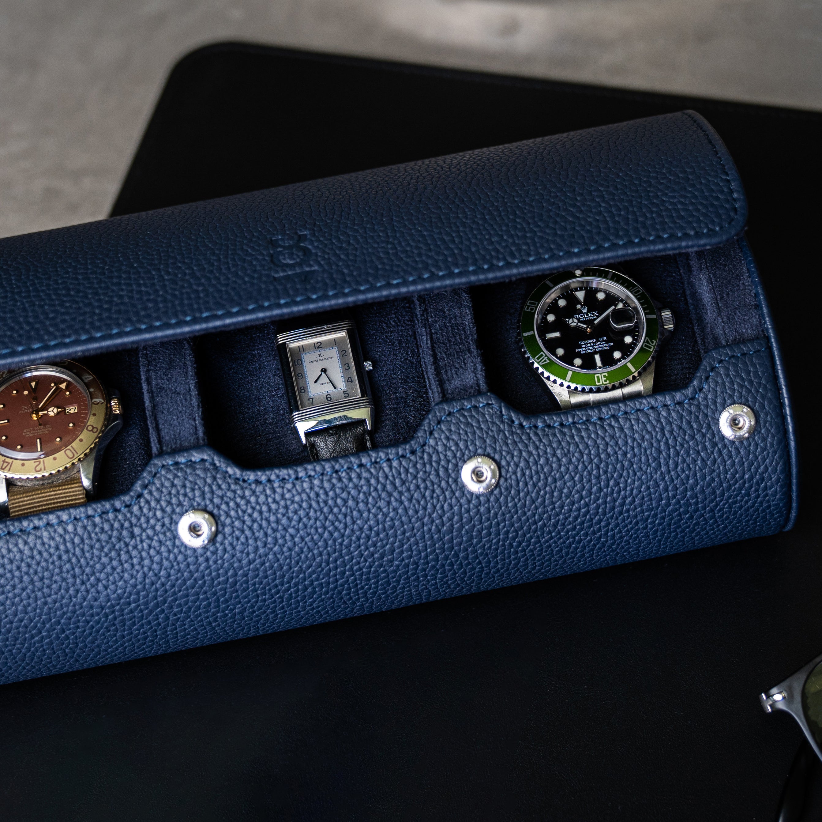 This Large Watch Roll is handmade of fine genuine leather with navy blue litchi exterior and holds up to three watches. A Watch Roll is ideal to carry your favourite watches with you on any occasion such as traveling, or just for daily storage at home.