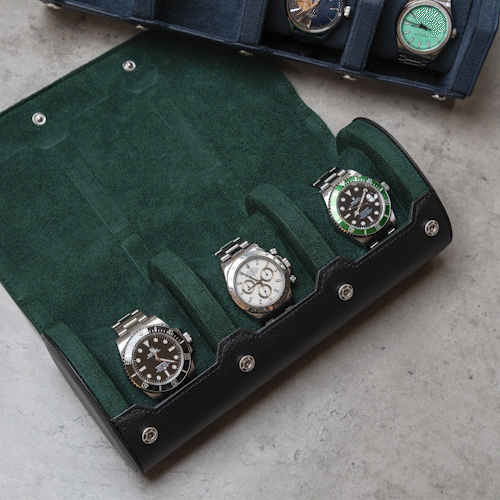 This Large Watch Roll is handmade of fine black genuine leather and holds up to three watches. The Watch Roll is ideal to carry your favourite watches with you on any occasion, or for daily storage.