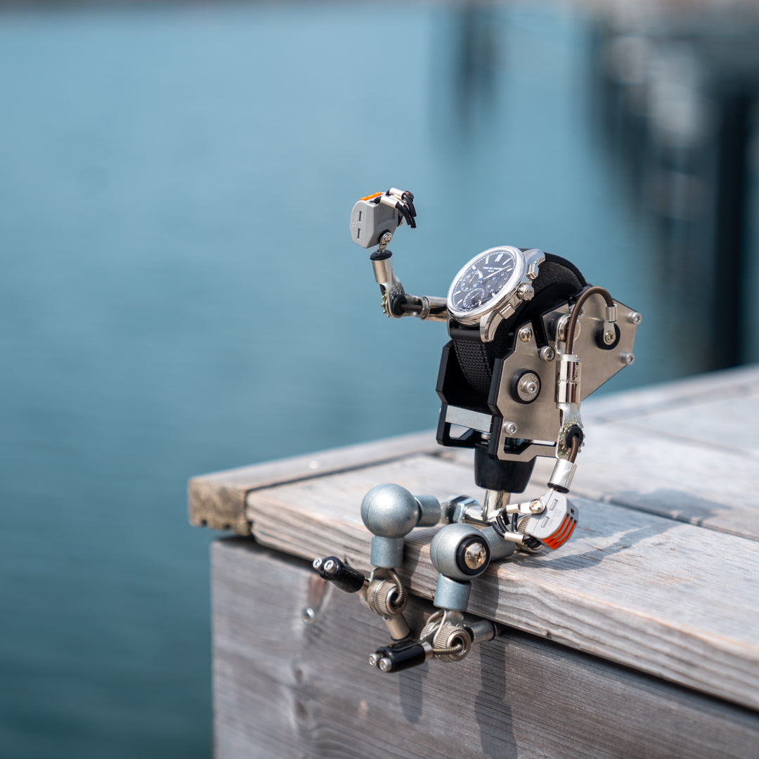 Meet our Robotoy. The Robotoy is the ultimate watch stand for your precious watch. The arms, hands and legs of the robot can be changed to a position of your choosing and it will give a different character to the Robotoy.