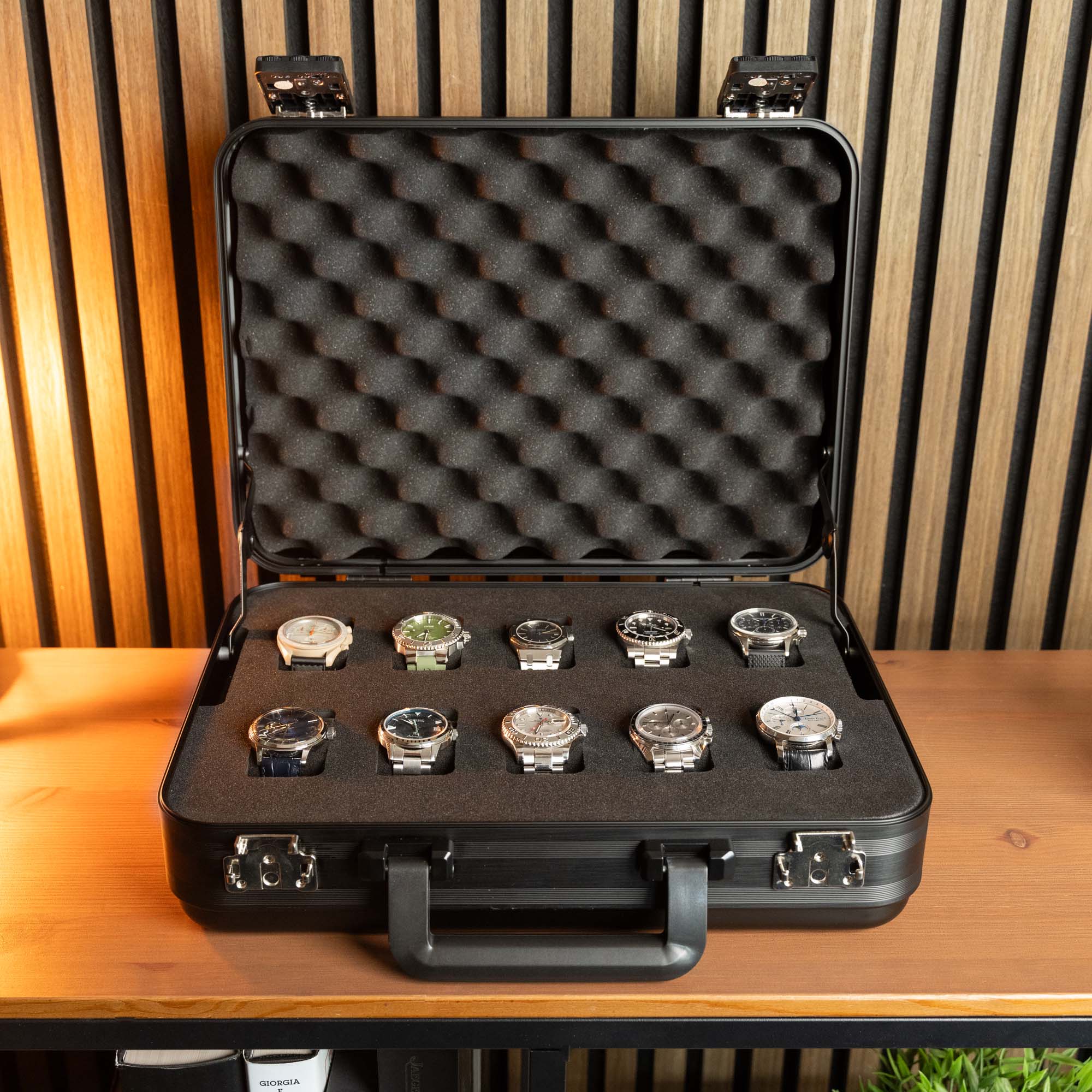 Schwarze Uhrenbox aus Aluminium mit 10 Fächern