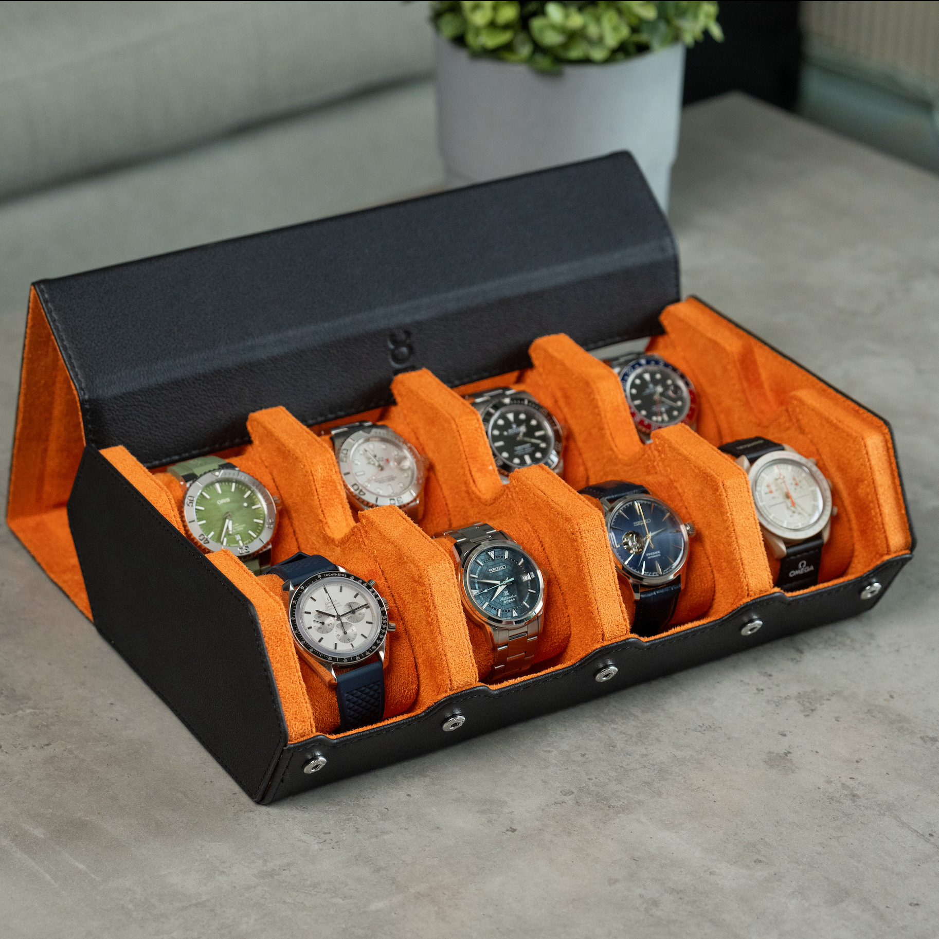 Sechseckige Uhrenbox mit 8 Fächern, Schwarz/Orange