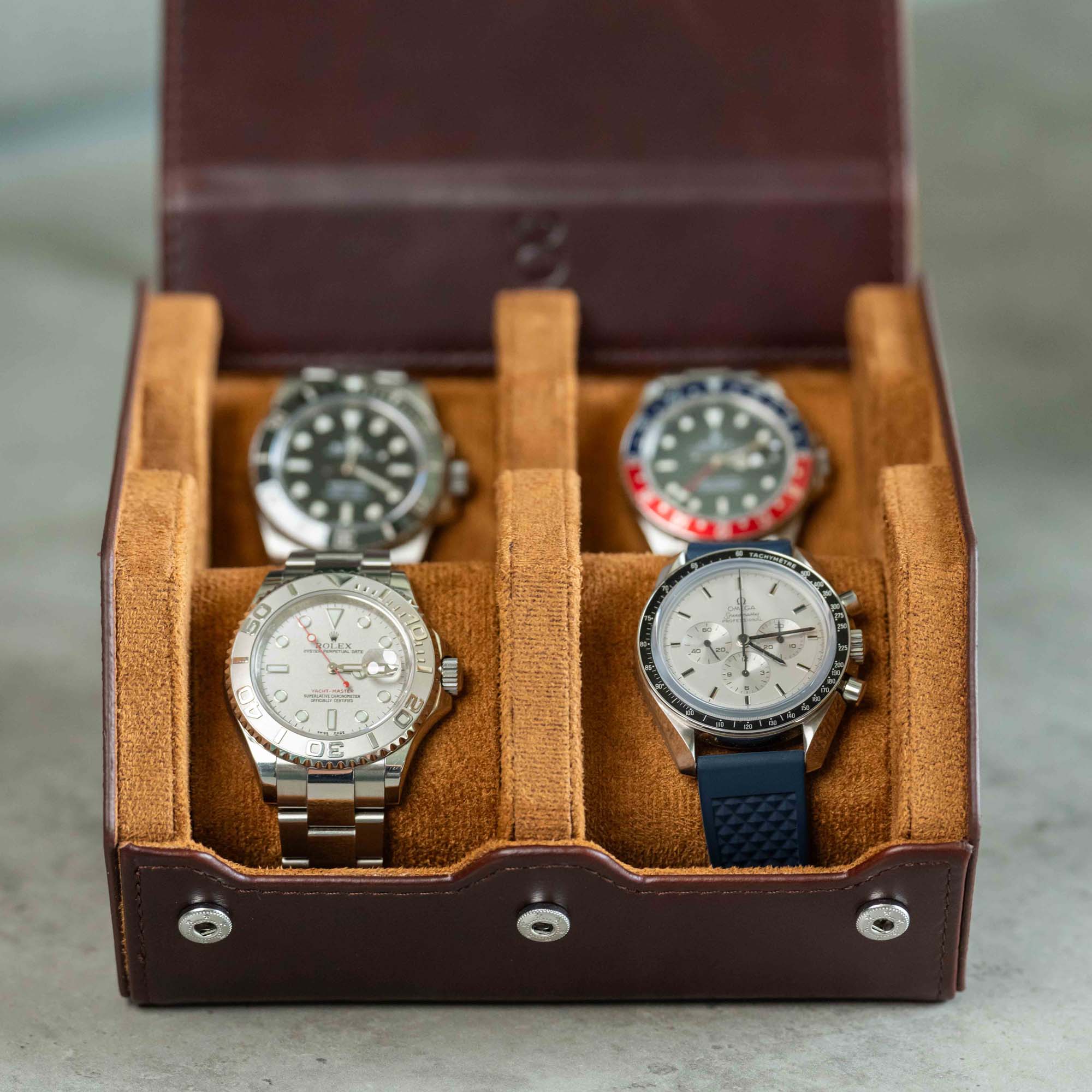 Eine perfekte Mischung aus Uhrenrolle und Uhrenbox. Wir präsentieren unsere Uhrenbox für 4 Uhren mit herausnehmbaren Kissen für jede einzelne Uhr mithilfe eines Schiebesystems. Sie wurde speziell für Uhrenliebhaber und Uhrensammler entwickelt, um ihre wertvollen Besitztümer zu schützen – egal, ob auf Reisen oder zur Aufbewahrung zu Hause. Die Uhrenbox ist handgefertigt aus feinem braunen Echtleder und bietet Platz für bis zu vier Uhren.