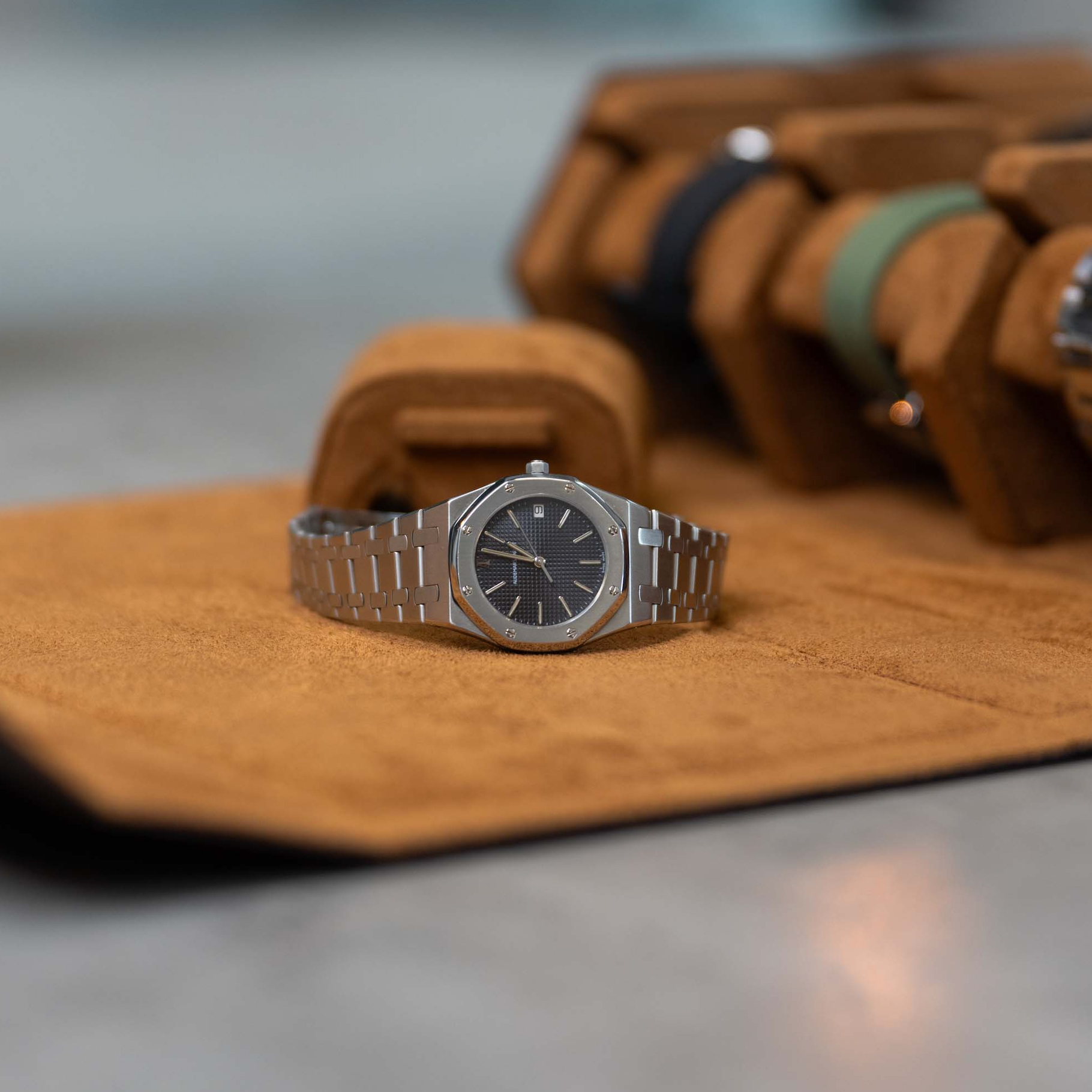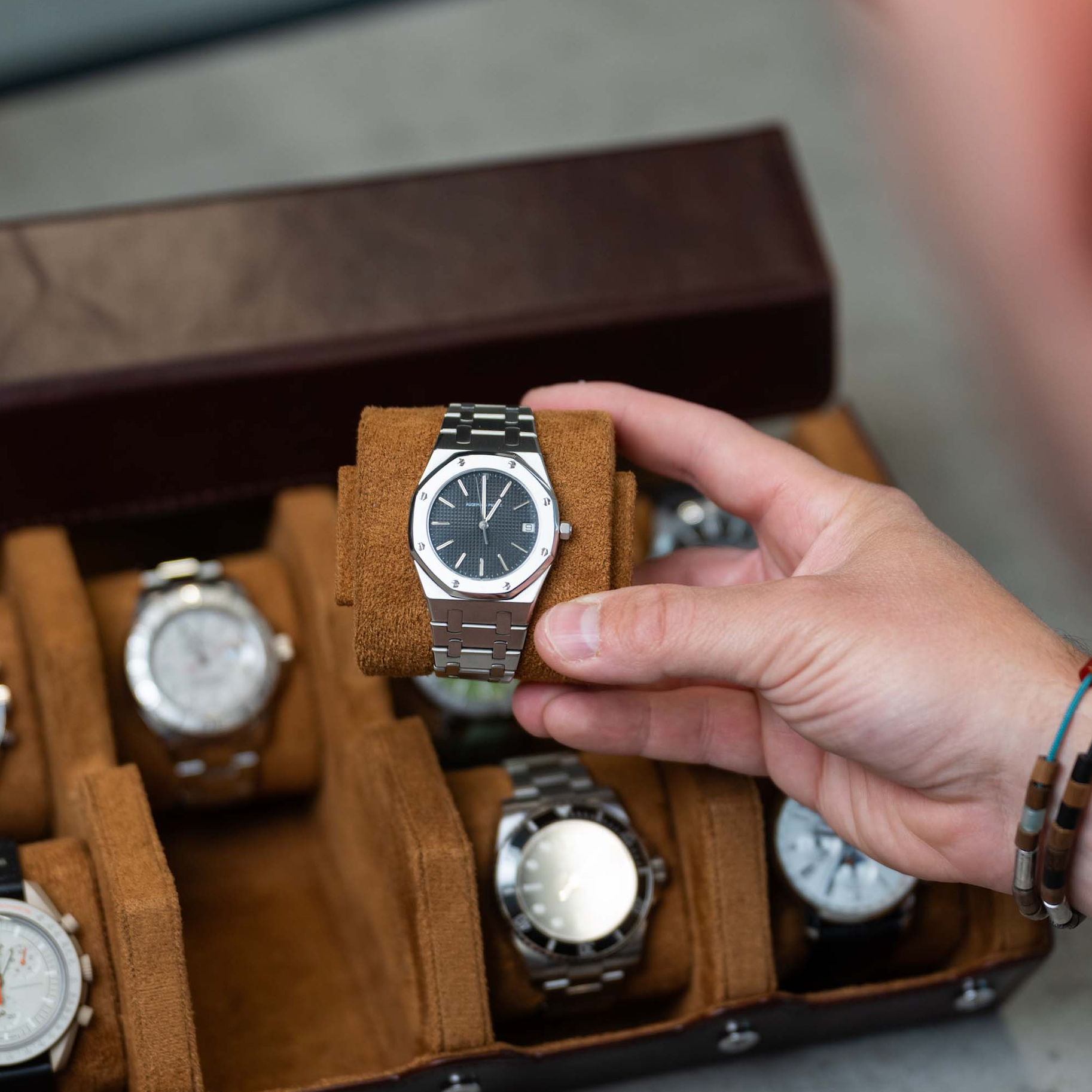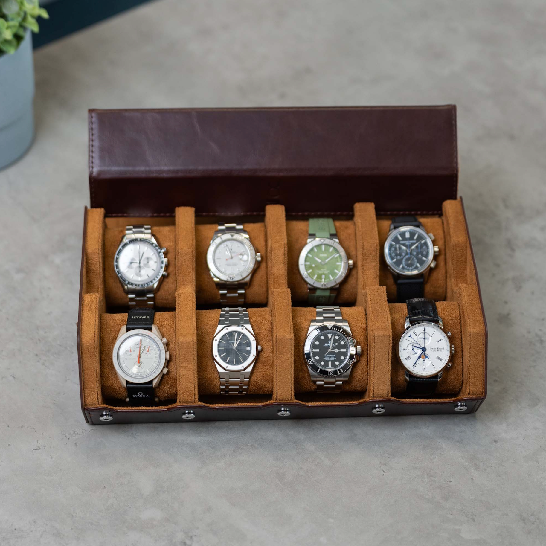 Eine perfekte Mischung aus Uhrenrolle und Uhrenbox. Wir präsentieren unsere Uhrenbox für 8 Uhren mit herausnehmbaren Kissen für jede einzelne Uhr mithilfe eines Schiebesystems. Sie wurde speziell für Uhrenliebhaber und Uhrensammler entwickelt, um ihre wertvollen Besitztümer zu schützen – egal, ob auf Reisen oder zur Aufbewahrung zu Hause. Die Uhrenbox ist handgefertigt aus feinem echtem braunem Leder und bietet Platz für bis zu acht Uhren.