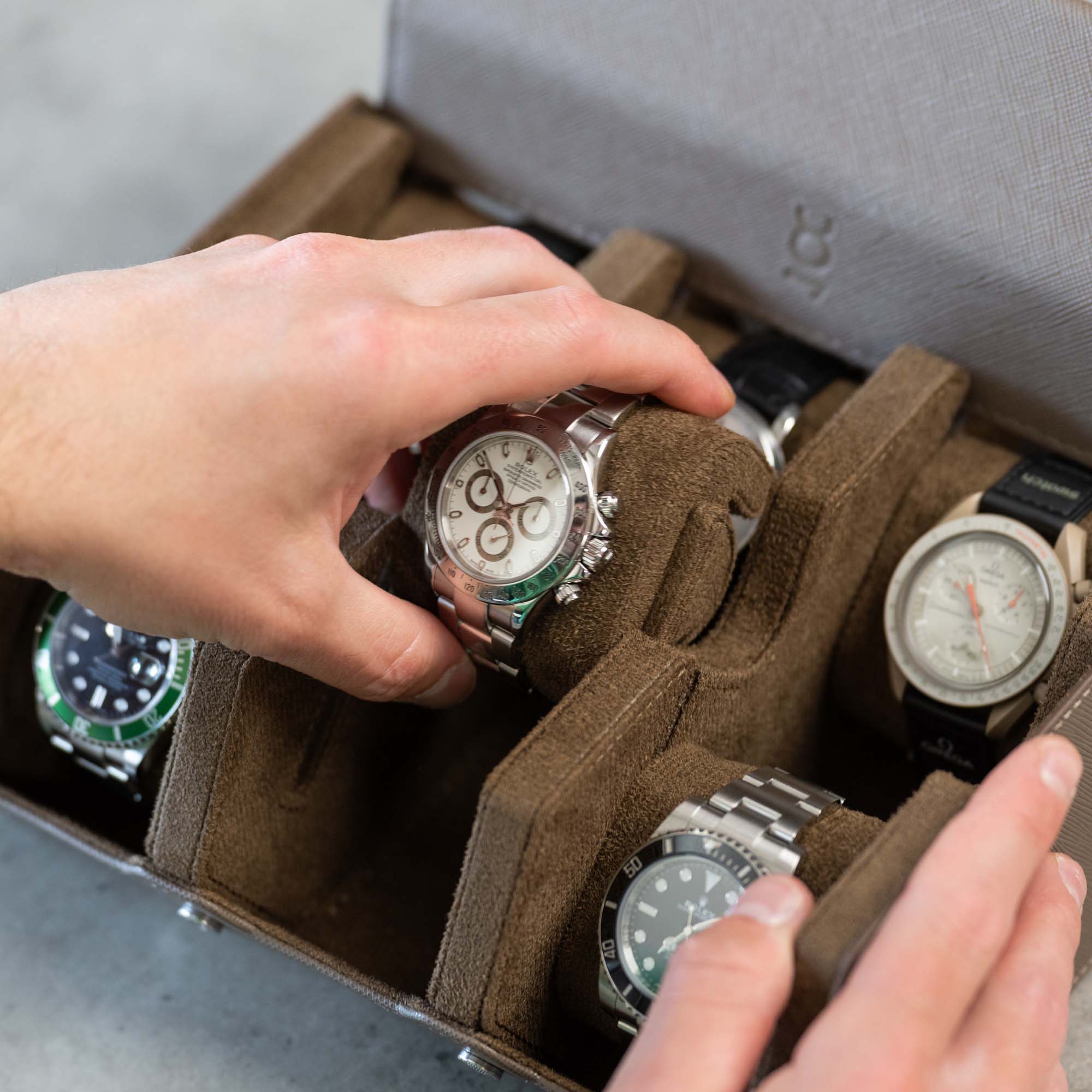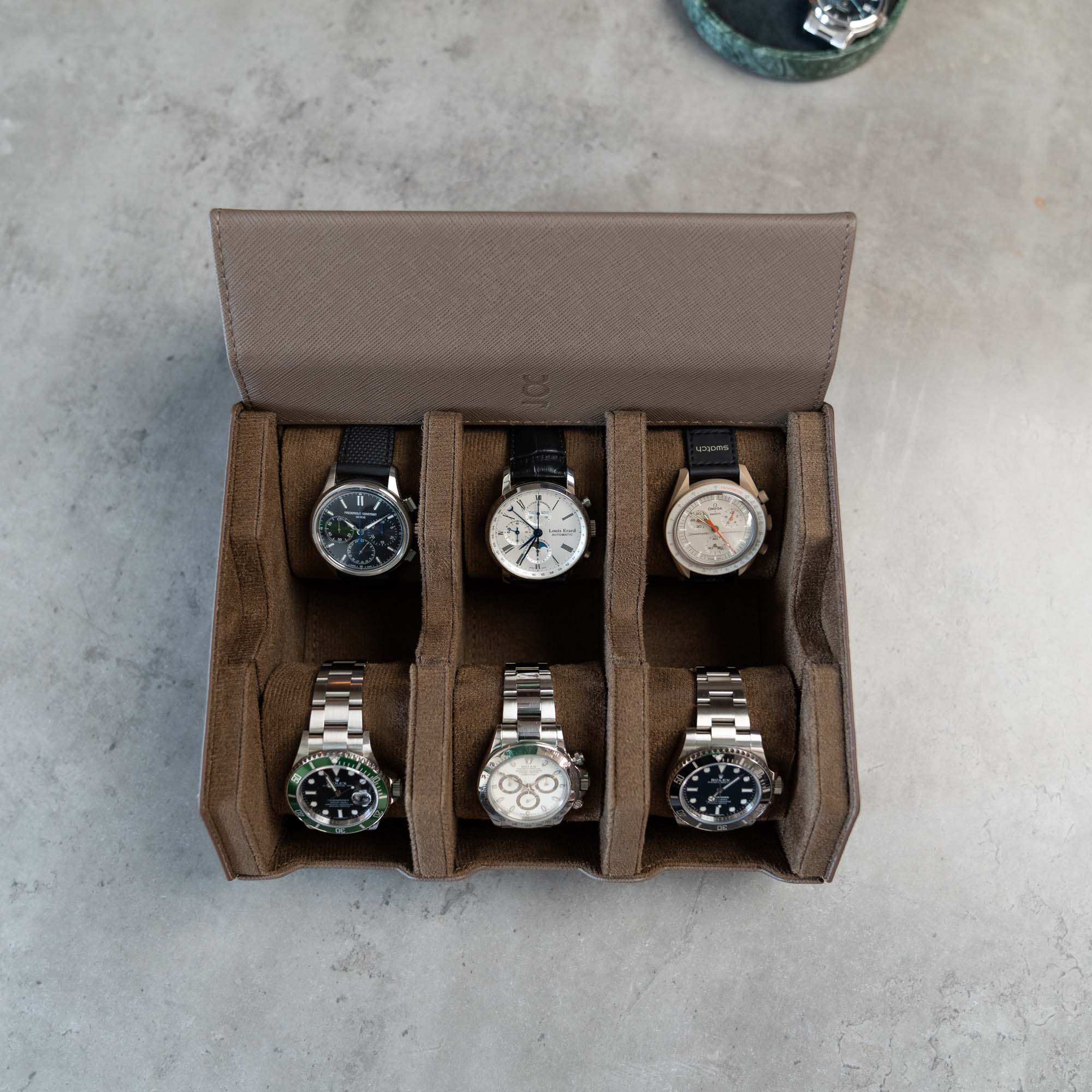 A perfect mix between a watch roll and a watch box. Introducing our watch box for 6 watches with removable cushions for each individual watch using a sliding system. It's specifically designed for watch enthusiasts and watch collectors to protect their prized possessions - whether it is for traveling or to store it at home. The Watch Box is hand made of fine genuine leather in saffiano pattern and holds up to six watches.