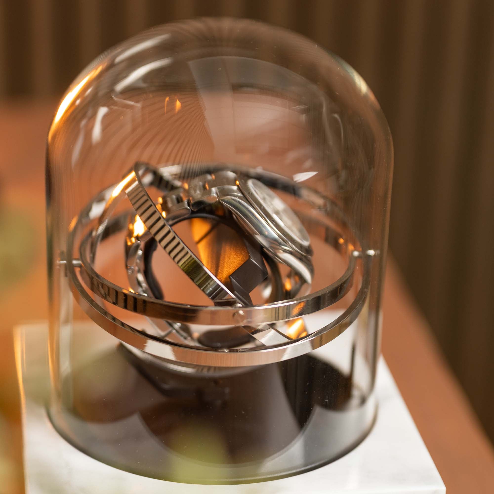 This striking single watch winder combines gyroscopic inspired motion with a solid marble base, making sure your mechanical watch is ready and functional at all times.