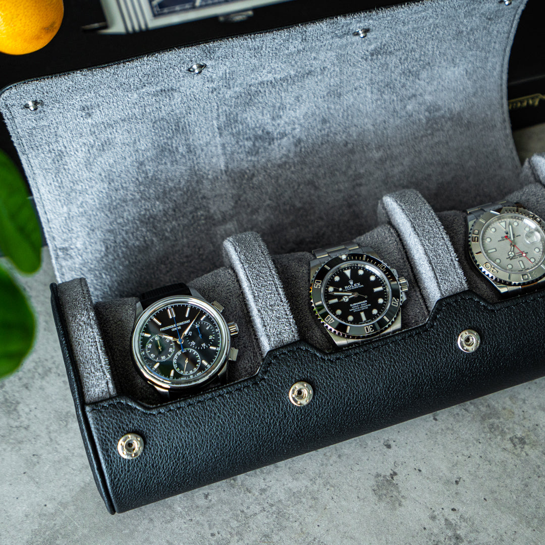 Die große, handgefertigte Uhrenrolle ist aus feinem schwarzem Echtleder und fasst bis zu drei Uhren. Die Uhrenrolle ist ideal, um Ihre Lieblingsuhren zu jedem Anlass mit sich zu führen oder um sie täglich aufzubewahren.