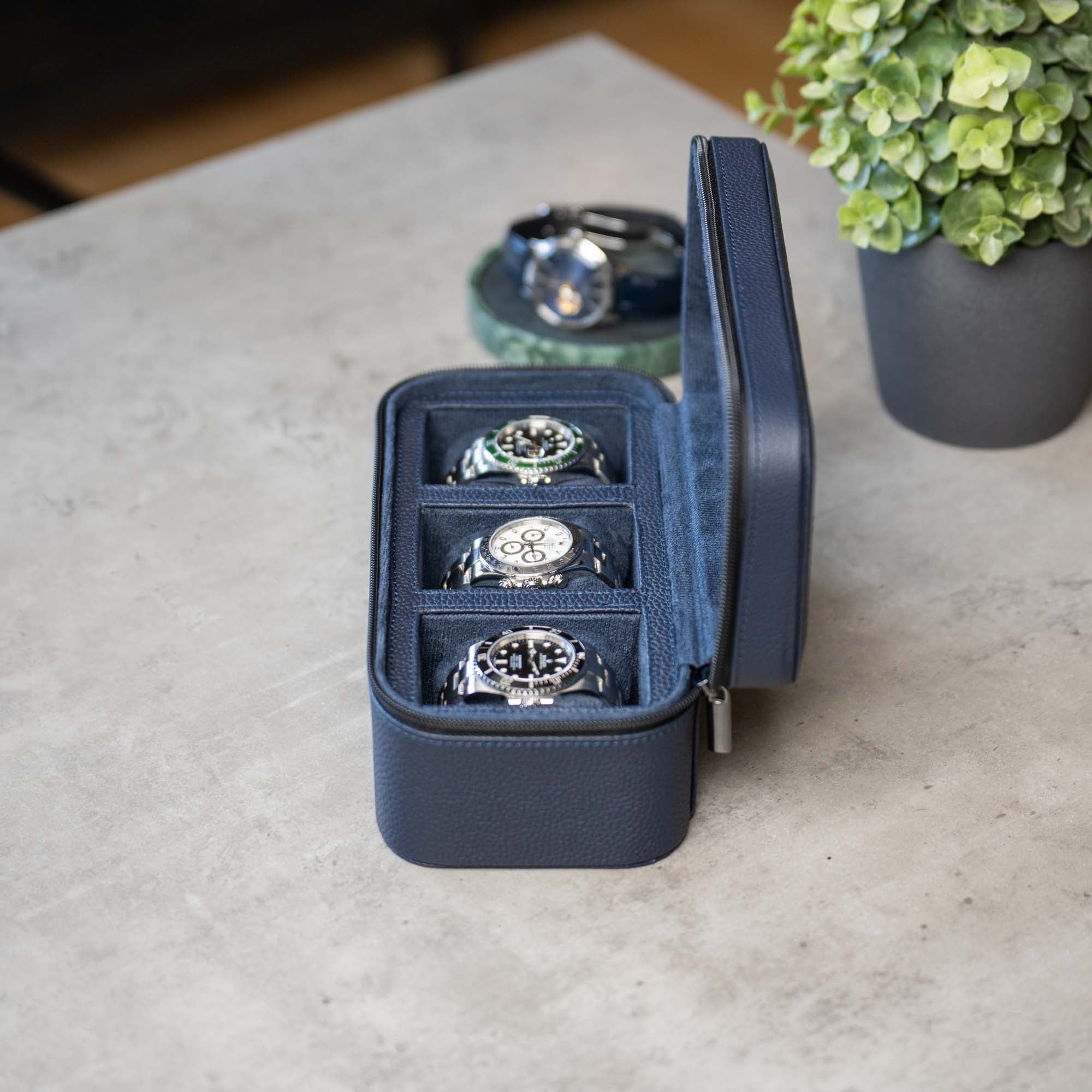 Elevate your timepiece storage with the Square Watch Box 3 Slot in Navy Blue Litchi. It's crafted with precision and elegance, this compact yet stylish box is the perfect home for your favorite timepieces. The Square Watch Box is made with fine genuine Navy Blue leather exterior and features a soft velvet litchi interior. This Watch Box offers a luxurious look and feel, while protecting your watch from dust, scratches, and damage.