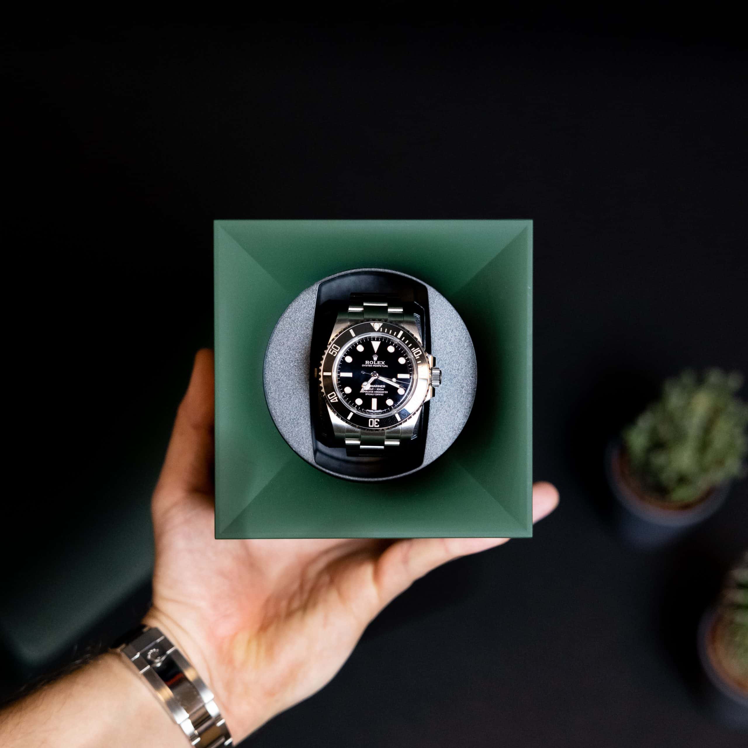 Der Uhrenbeweger StartBox Green verfügt über ein modernes Design, um eine Ihrer Uhren zu halten und sie für eine genaue Zeitmessung immer vollständig aufgezogen zu halten. Dieser Uhrenbeweger arbeitet geräuschlos und wird von zwei Standard-C-Typ-Batterien betrieben. Perfekte Möglichkeit, Ihre Uhren zu Hause auf elegante Weise zu präsentieren.