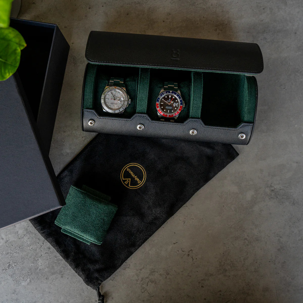 Diese große Uhrenrolle ist aus feinem schwarzem Echtleder handgefertigt und bietet Platz für bis zu drei Uhren. Die Uhrenrolle ist ideal, um Ihre Lieblingsuhren zu jeder Gelegenheit bei sich zu tragen oder für die tägliche Aufbewahrung.