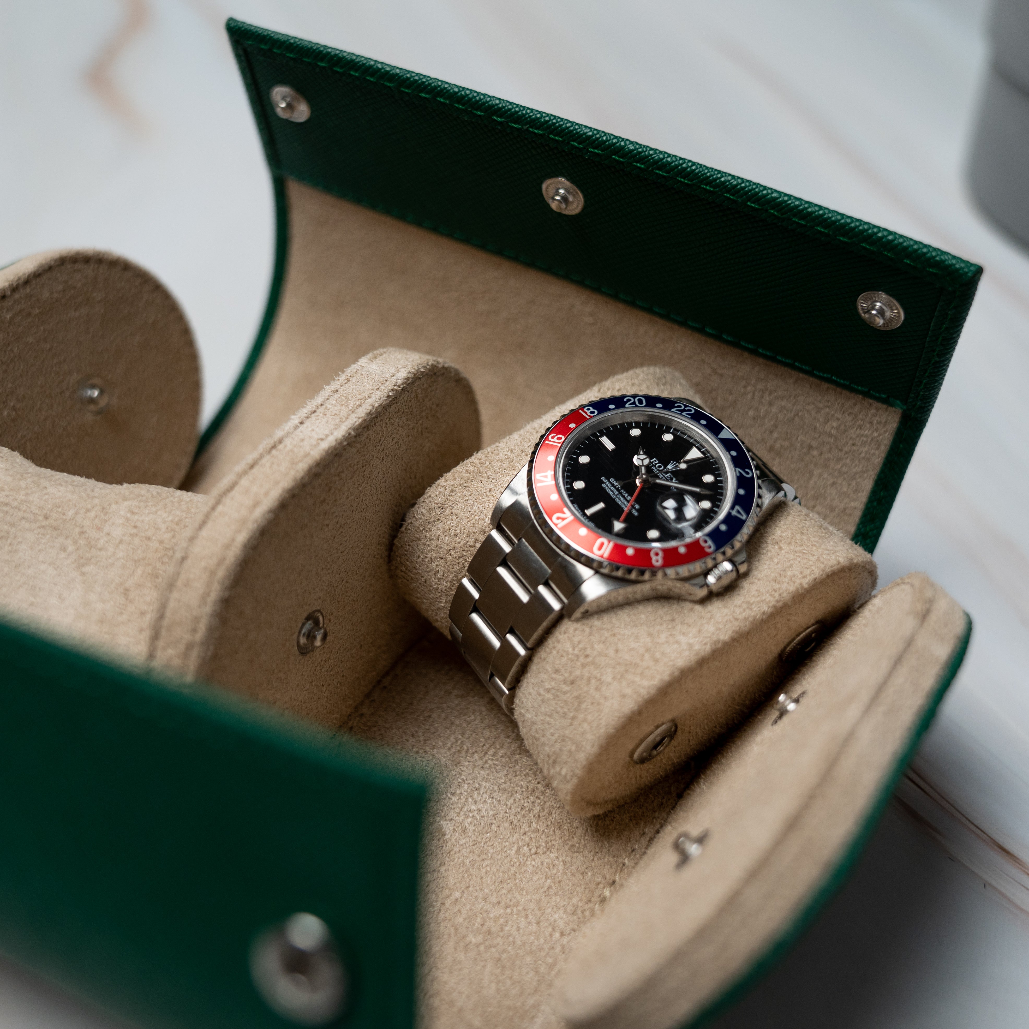 Die Uhrenrolle für zwei Uhren ist das perfekte Zuhause für Ihre Lieblingsuhren. Sie ist ideal, um Ihre Uhren zu jeder Gelegenheit bei sich zu tragen oder für die tägliche Aufbewahrung. Es ist handgefertigt aus feinem echtem grünem Saffiano-Leder, einem langlebigen Ledermaterial, das häufig von Luxusmarken verwendet wird .