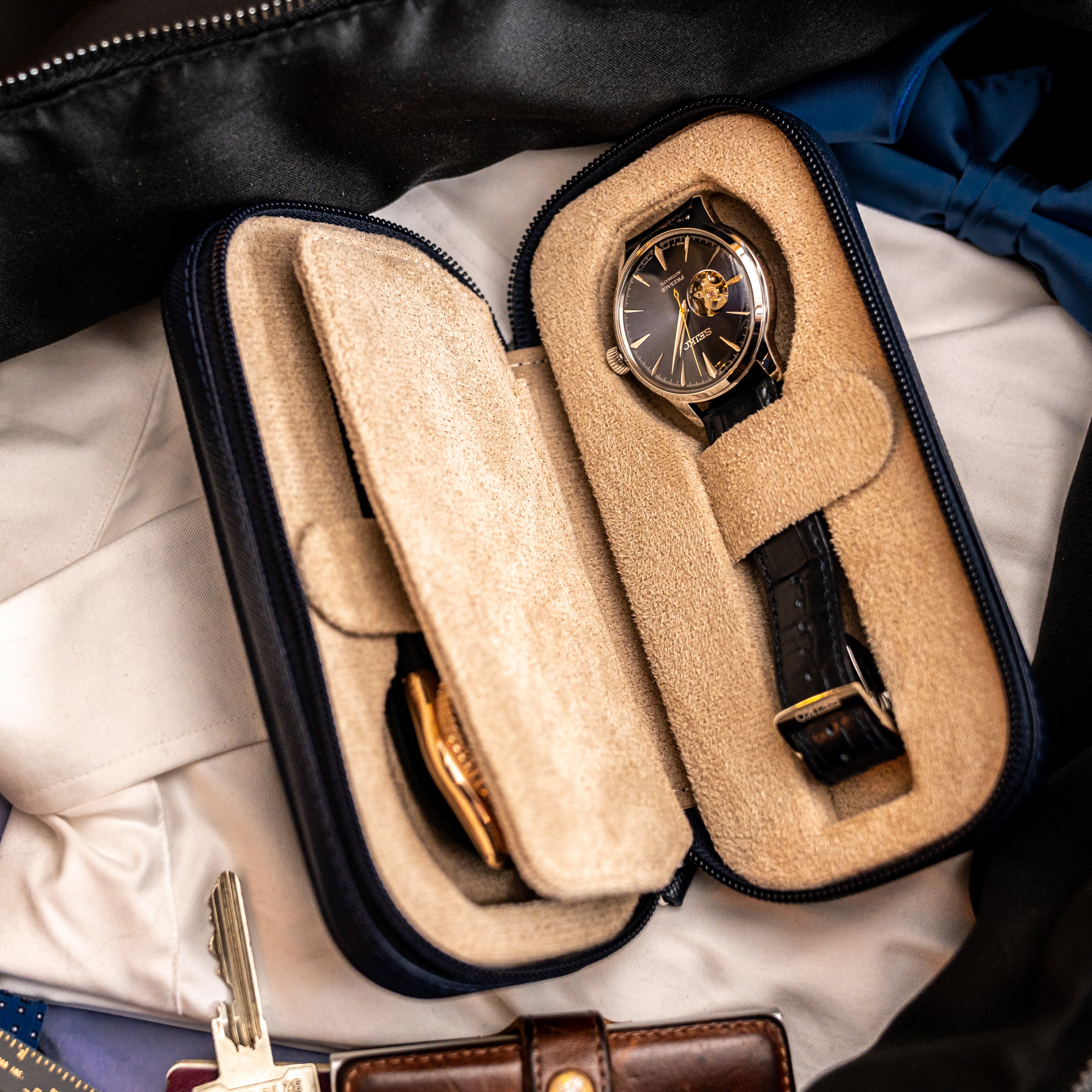 Dieses Uhrenetui für zwei Uhren ist aus feinem Echtleder mit marineblauer Saffianleder-Außenseite handgefertigt und bietet Platz für bis zu zwei Uhren. Ideal, um Ihre wertvollen Besitztümer zu jeder Gelegenheit bei sich zu tragen.